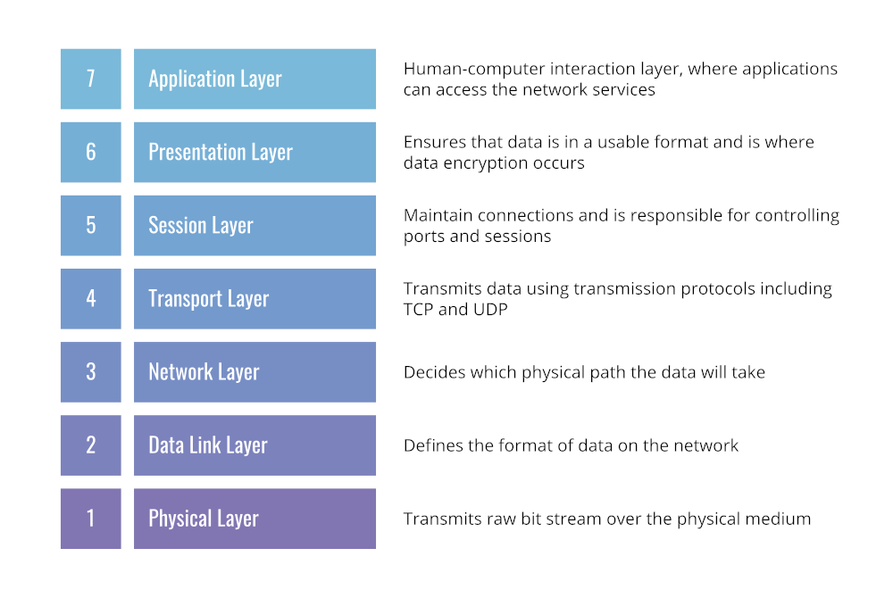 The model is split into seven different abstraction layers: Physical, Data Link, Network, Transport, Session, Presentation, and Application.